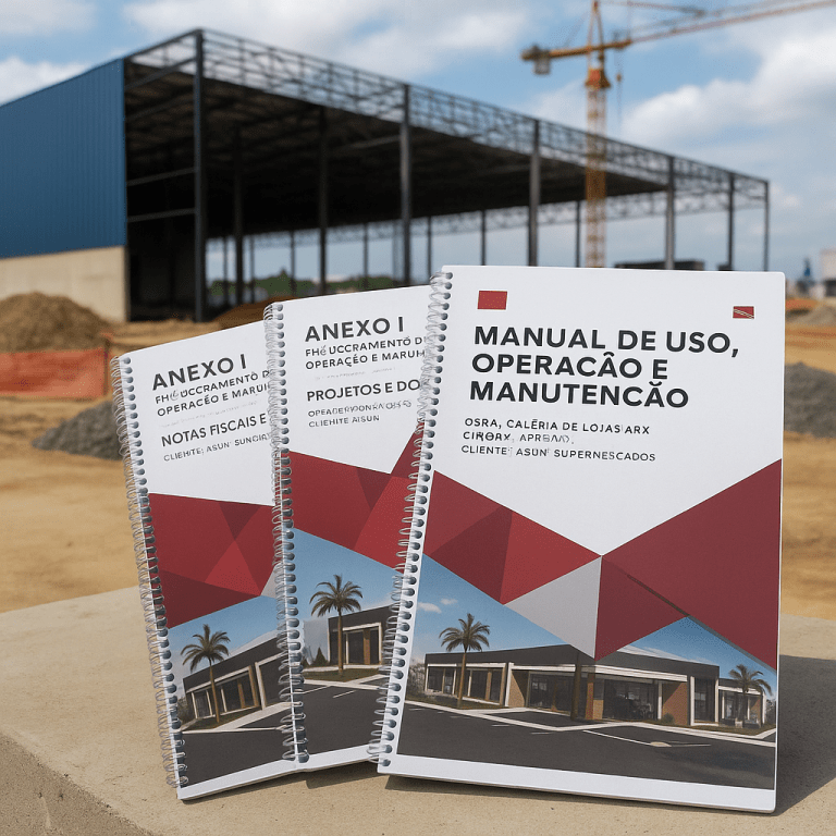 Ao fim do projeto, é entregue um conjunto completo que inclui desenhos “as-built”, garantias, certificados, manuais de operação e manutenção, notas fiscais e relatórios finais.